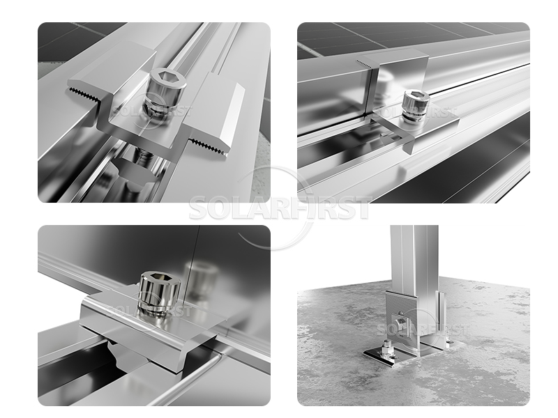 Ce système de montage de module solaire est une structure de montage hautement anticorrosion pour une installation au sol grâce à son alliage d'aluminium 6005 et son matériau en acier inoxydable 304.