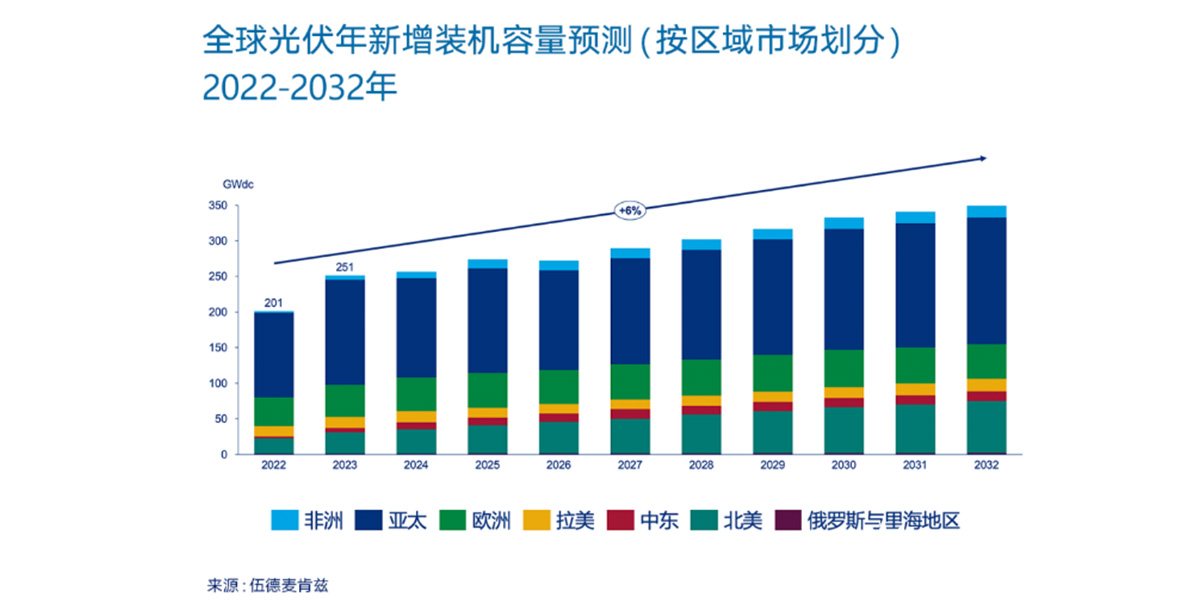 Wood Mackenzie prévoit une croissance annuelle moyenne de 6 % des installations photovoltaïques mondiales entre 2022 et 2032, l'Amérique du Nord dépassant la part annuelle de l'Europe d'ici 2028.
