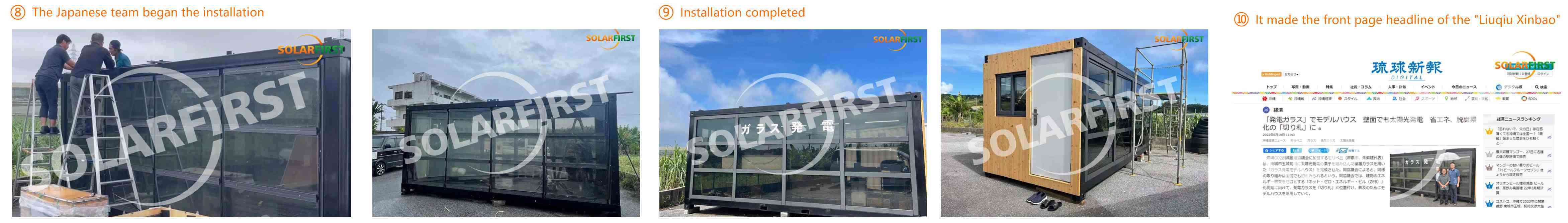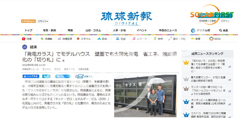 • Selon le Ryukyu Shinpo du Japon, l'Association de promotion de la réduction du dioxyde de carbone de Ryukyu considère les produits de verre solaire de Solar First comme « l'atout » pour promouvoir les « bâtiments à énergie zéro ».