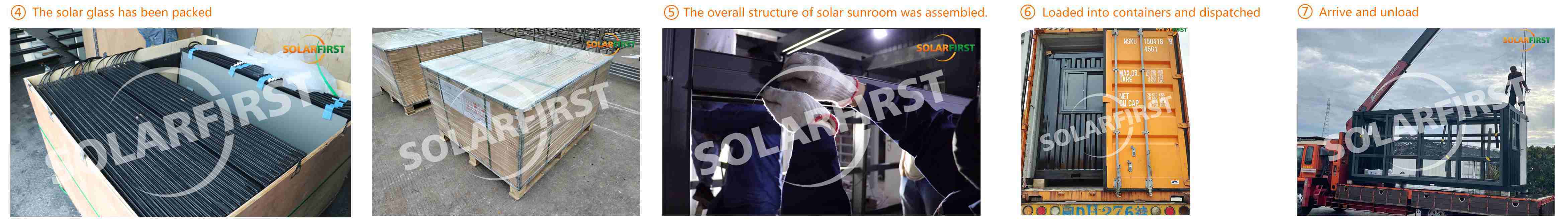 • 26 mai 2022 : Le vitrage solaire a été emballé. La structure principale de la véranda a été assemblée. Elle a été chargée dans des conteneurs et expédiée.