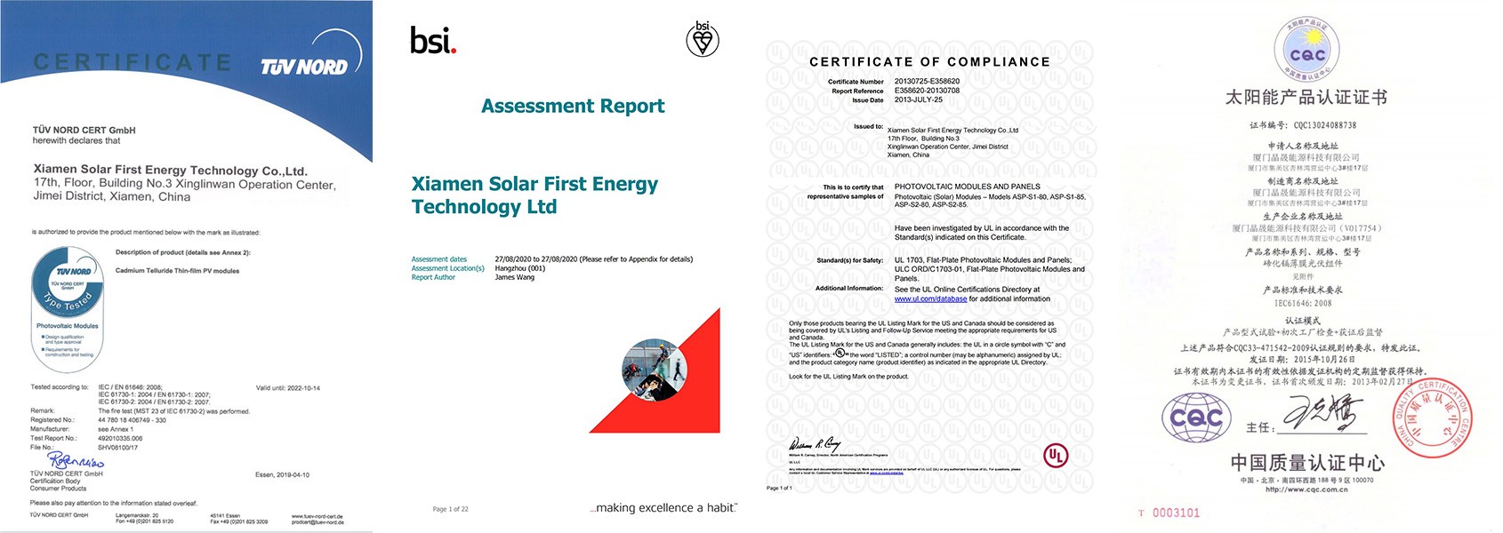 Le verre photovoltaïque au tellurure de cadmium (CdTe) de Solar First a été certifié par des institutions de renommée mondiale telles que TUV SUD (TUV), British Standards Institution (BSI) et Micro Power Generation Product Certification Scheme (MCS).