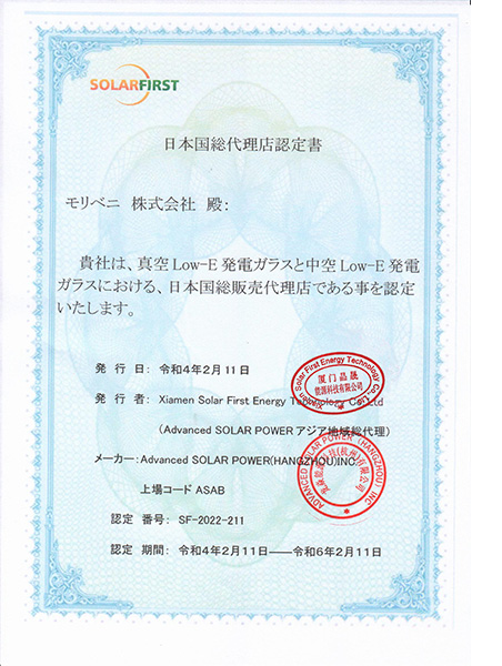 Le 11 février 2022, Solar First a signé un accord d'agence exclusif avec la célèbre société japonaise モリベニ 株式会社, l'autorisant à agir en tant qu'agent général de la société au Japon.