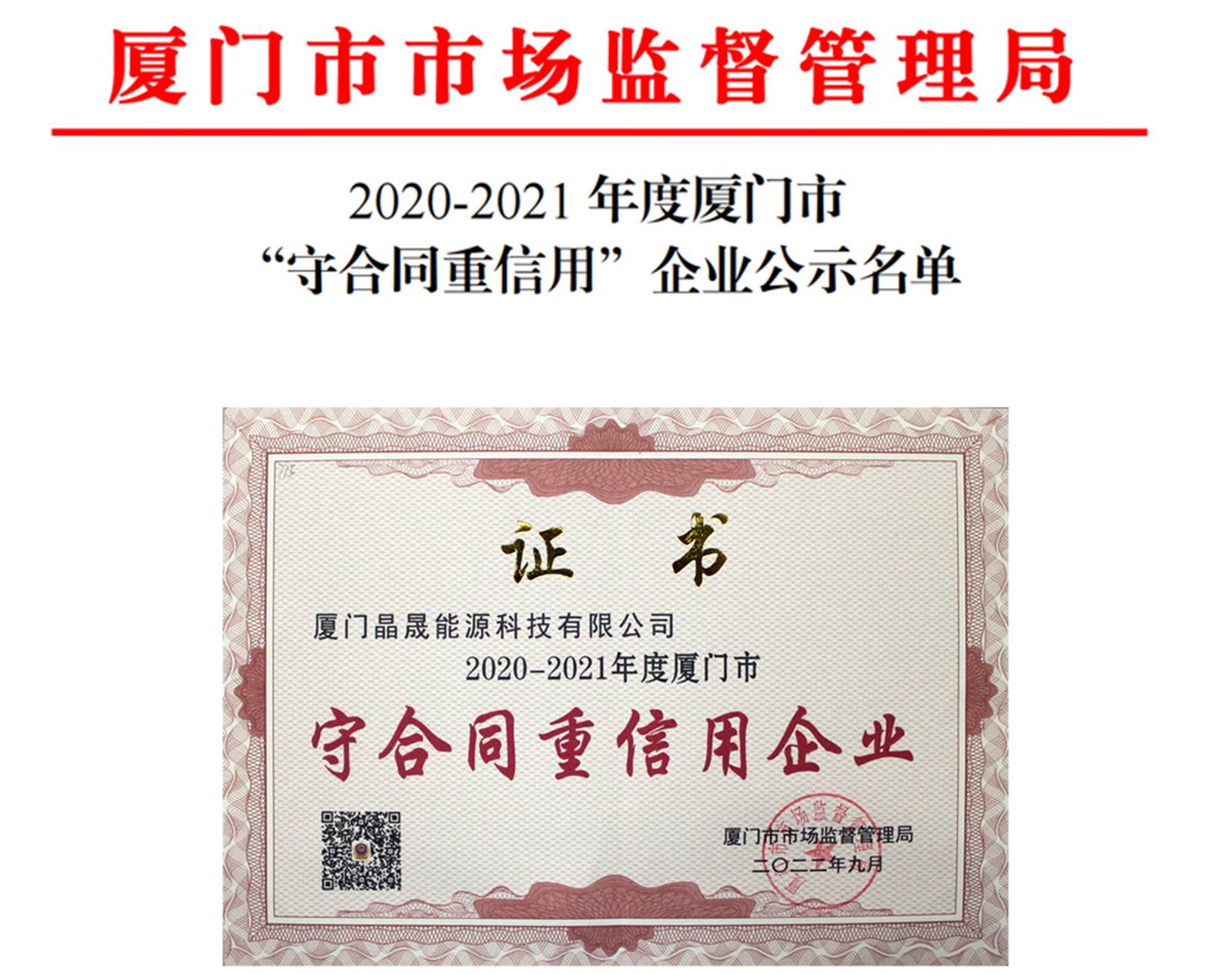 Solar First Group a reçu le certificat « Entreprise respectant les contrats et les crédits » 2020-2021 du Bureau de supervision et d'administration du marché de Xiamen. Cette prestigieuse distinction fait suite à la récente certification nationale d'entreprise de haute technologie obtenue par l'entreprise.