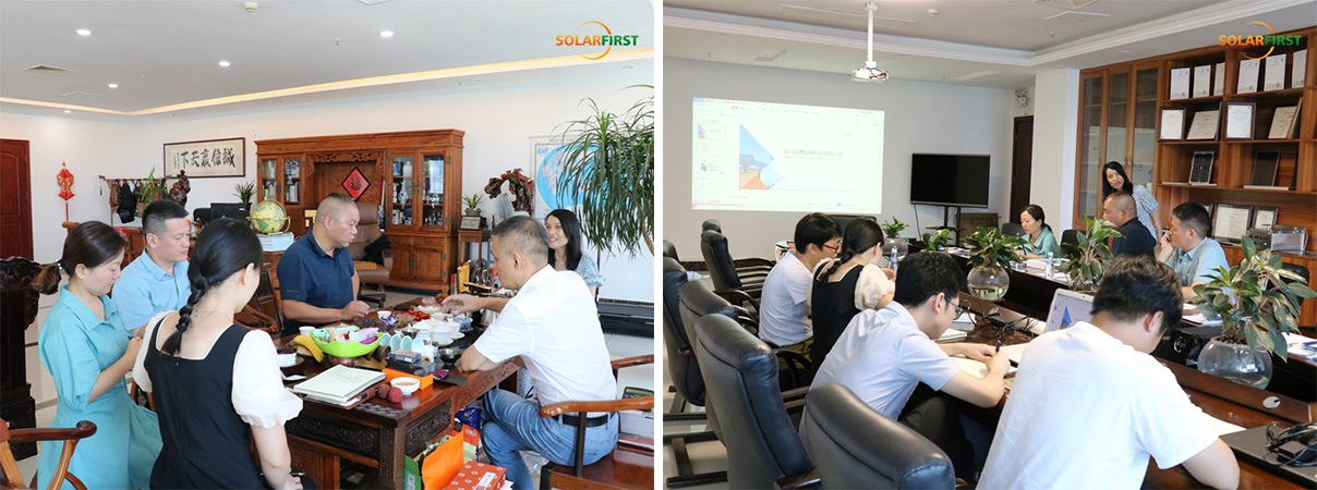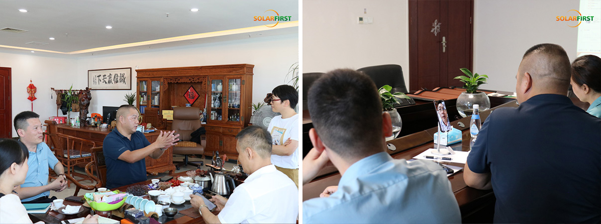 Le 21 juillet 2022, des dirigeants de Xinyi Glass Engineering (Dongguan) Co., Ltd. (« Xinyi Glass ») ont visité Solar First Group. La délégation était composée du vice-président Liao Jianghong, du directeur général adjoint Li Zixuan et du directeur commercial Zhou Zhenghua. Ils ont été accueillis par Ye Songping, président de Solar First Group, et Zhou Ping, directeur général, afin d'échanger sur le soutien collaboratif à la recherche et développement de produits photovoltaïques intégrés au bâtiment (BIPV).