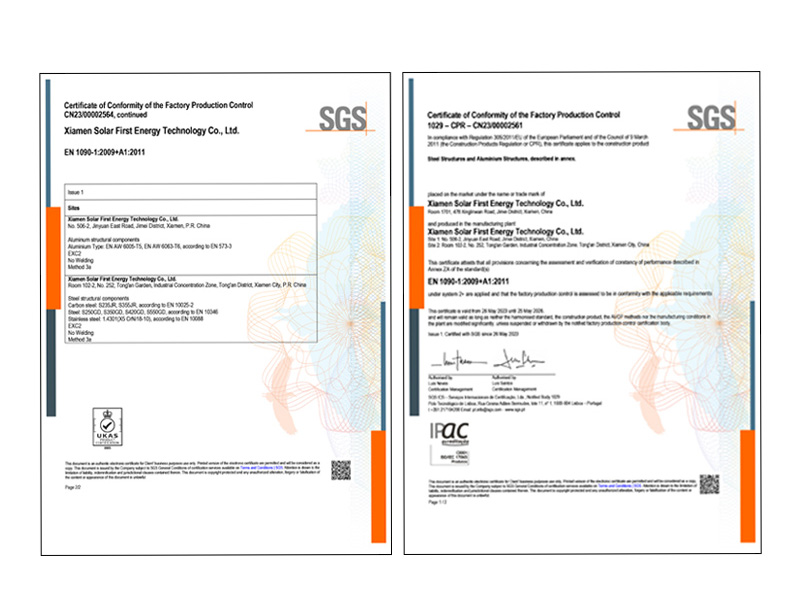 Cette certification s'applique à Structures en acier et structures en aluminium commercialisé sous le nom Xiamen Solar First Energy Technology Co., Ltd. marque, fabriquée dans les installations de production de l'entreprise.