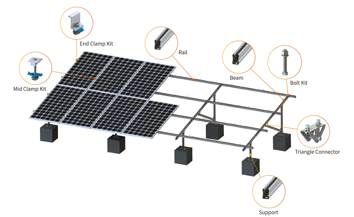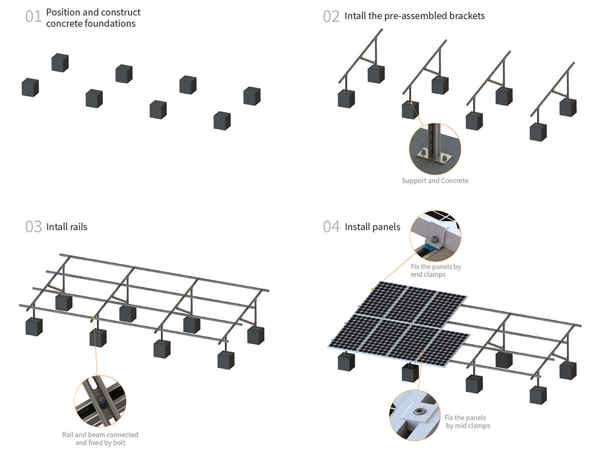 Les poutres et supports clés sont préassemblés en usine afin de minimiser la main-d'œuvre sur site et d'accélérer l'installation. La plaque de base de conception unique permet un réglage en hauteur et un positionnement avant-arrière, offrant ainsi une grande flexibilité pour s'adapter aux différents terrains et aux exigences d'agencement des modules.