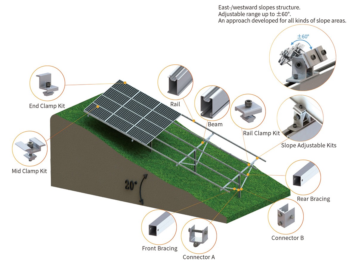 Le système utilise des pieux battus qui stabilisent efficacement les terrains accidentés ou en pente sans nécessiter de travaux d'excavation importants. Des connecteurs réglables spéciaux permettent un alignement précis des panneaux solaires vers le sud, améliorant ainsi le rendement énergétique, même dans les paysages complexes.
